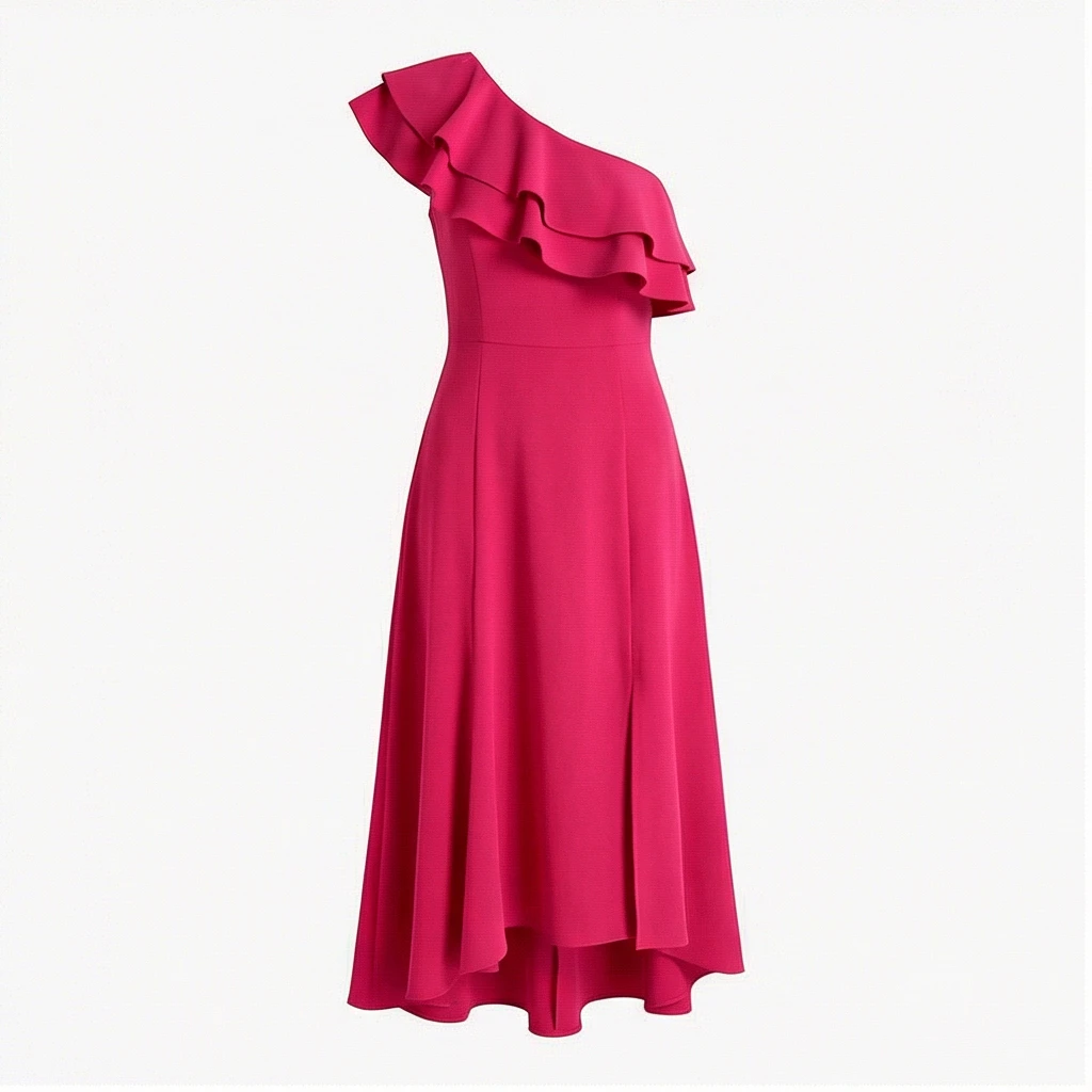 Vestido de fiesta asimétrico en tono fucsia, con volante en el escote y falda fluida de gran presencia.