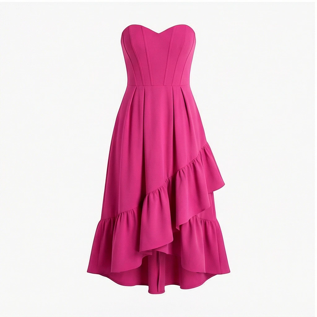 Vestido de fiesta palabra de honor en tono fucsia, con falda escalonada y diseño dinámico.