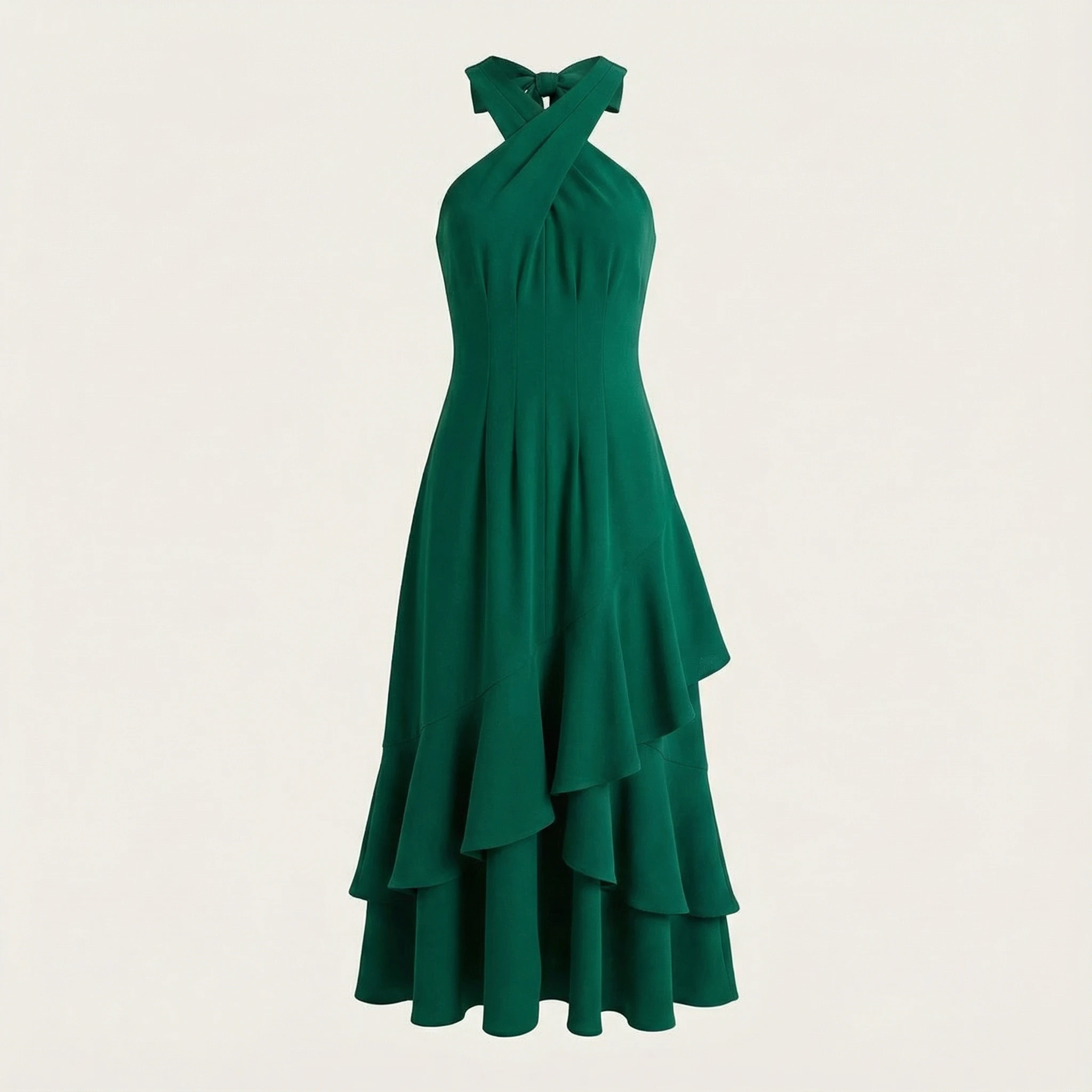 Vestido de fiesta en verde intenso, con escote halter cruzado y falda fluida que aporta elegancia y una silueta estilizada.