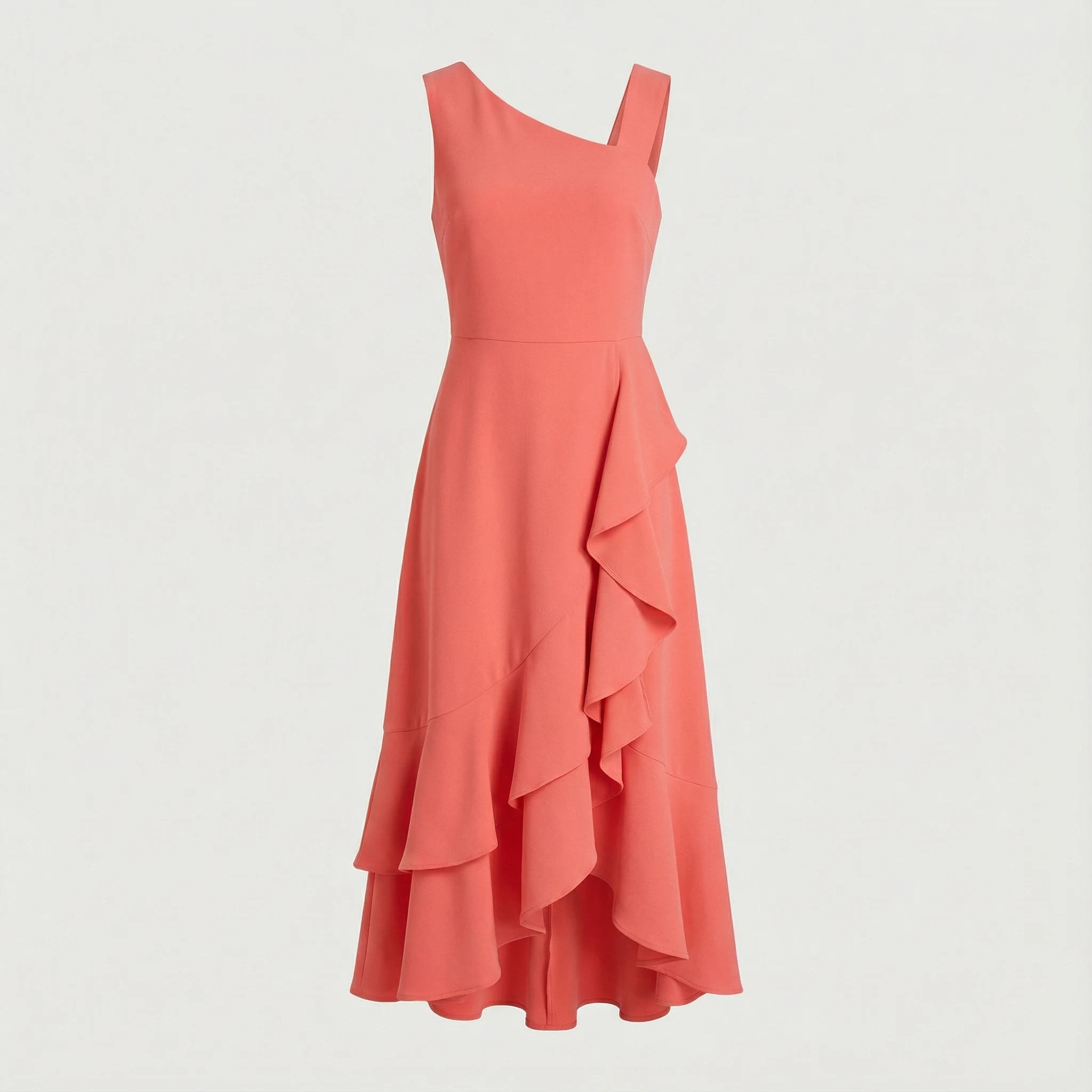 Vestido de fiesta en tono coral, con escote recto y falda con volantes que aportan movimiento y frescura.