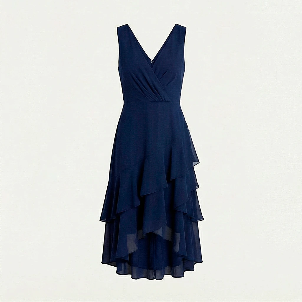 Vestido de fiesta en azul marino, con escote en V y falda con capas que aportan profundidad y movimiento.