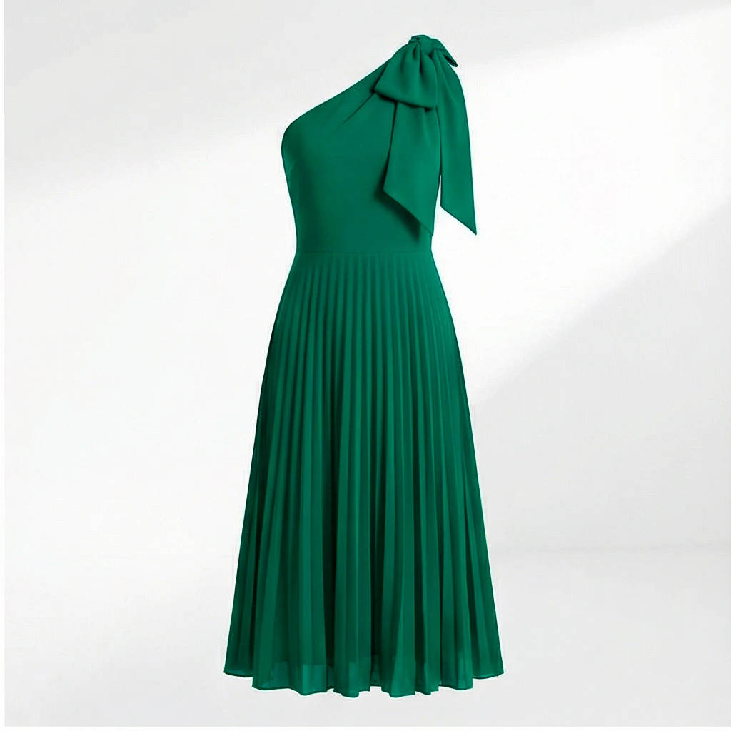 Vestido de fiesta en verde intenso, con diseño plisado y escote asimétrico que aporta carácter y sofisticación.