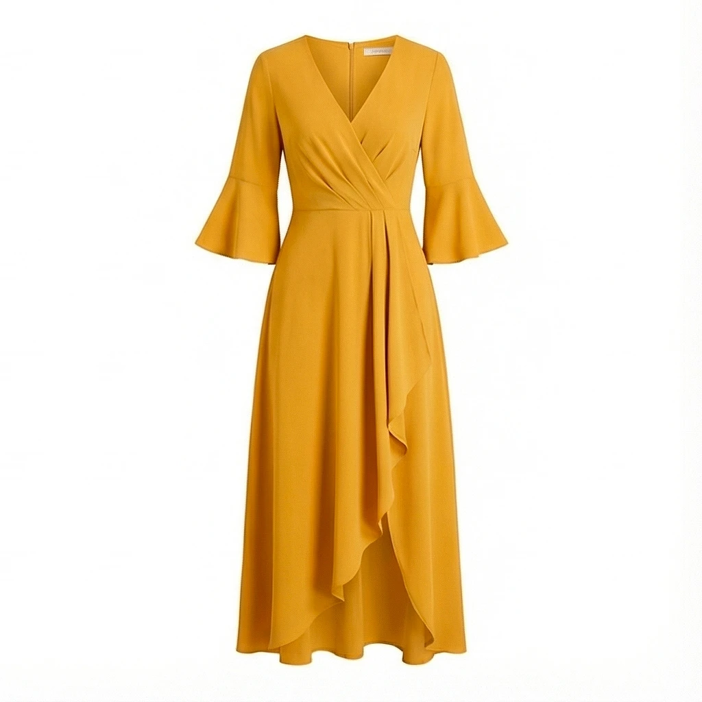 Vestido de fiesta en tono mostaza, con escote cruzado y manga acampanada que aporta personalidad y estilo.
