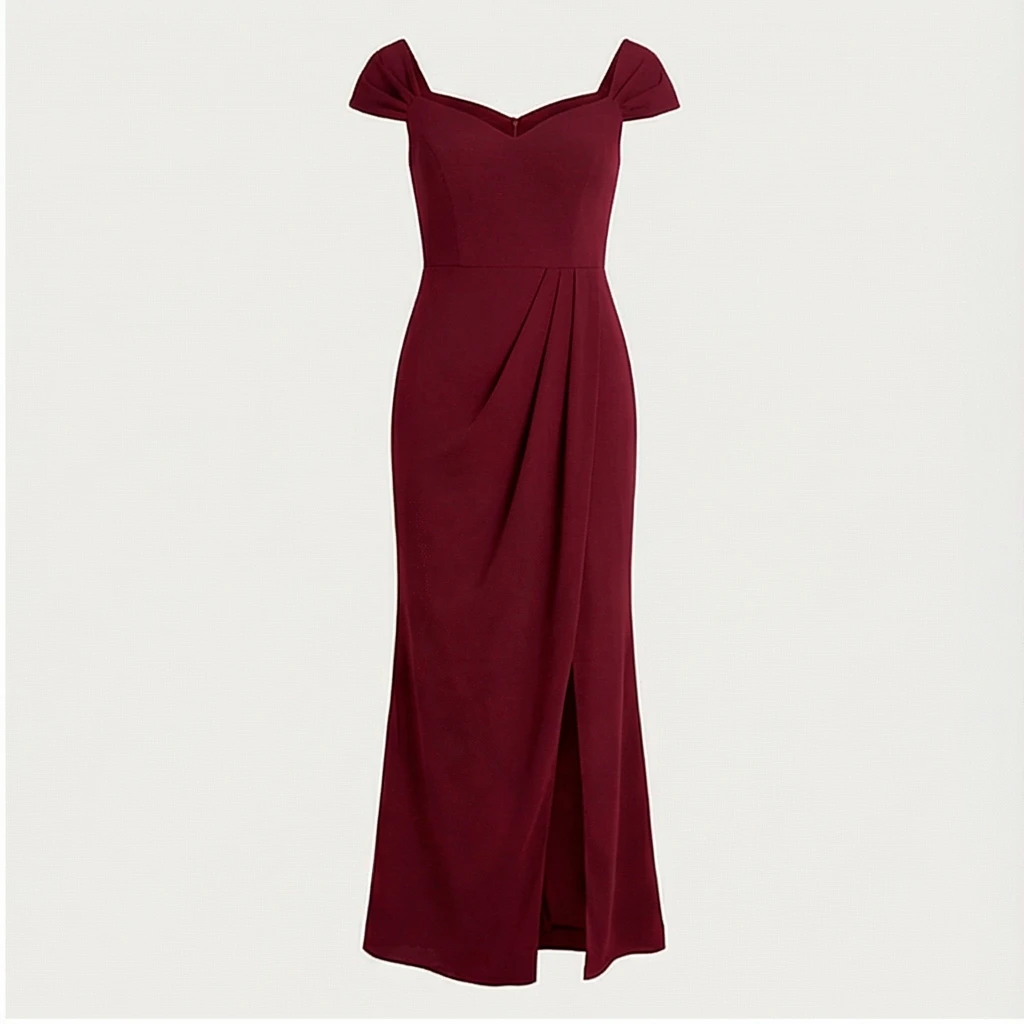 Vestido de fiesta en tono burdeos, con escote barco y silueta entallada que realza la figura con elegancia.