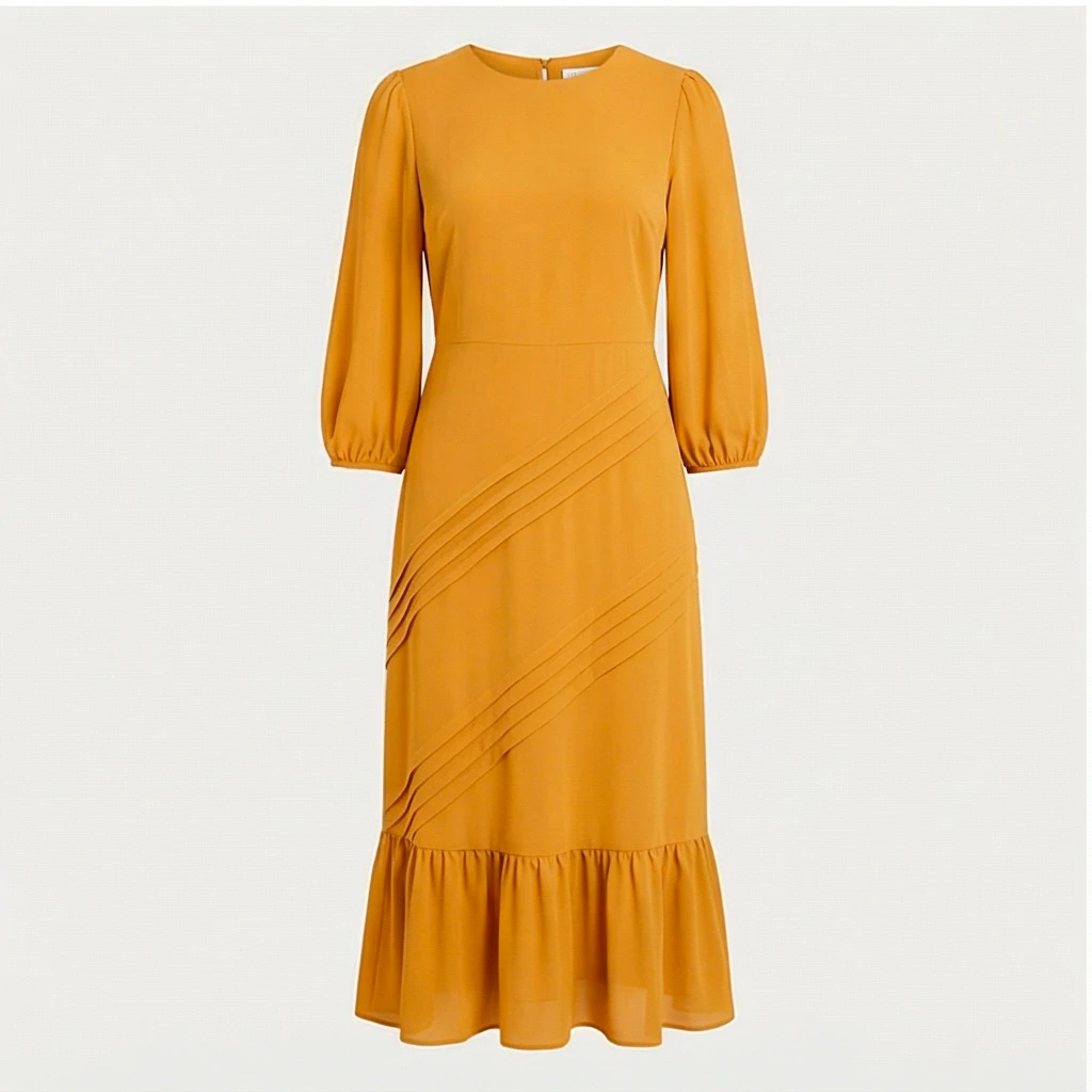 Vestido de fiesta en tono mostaza, con manga larga y falda asimétrica que aporta movimiento y modernidad.