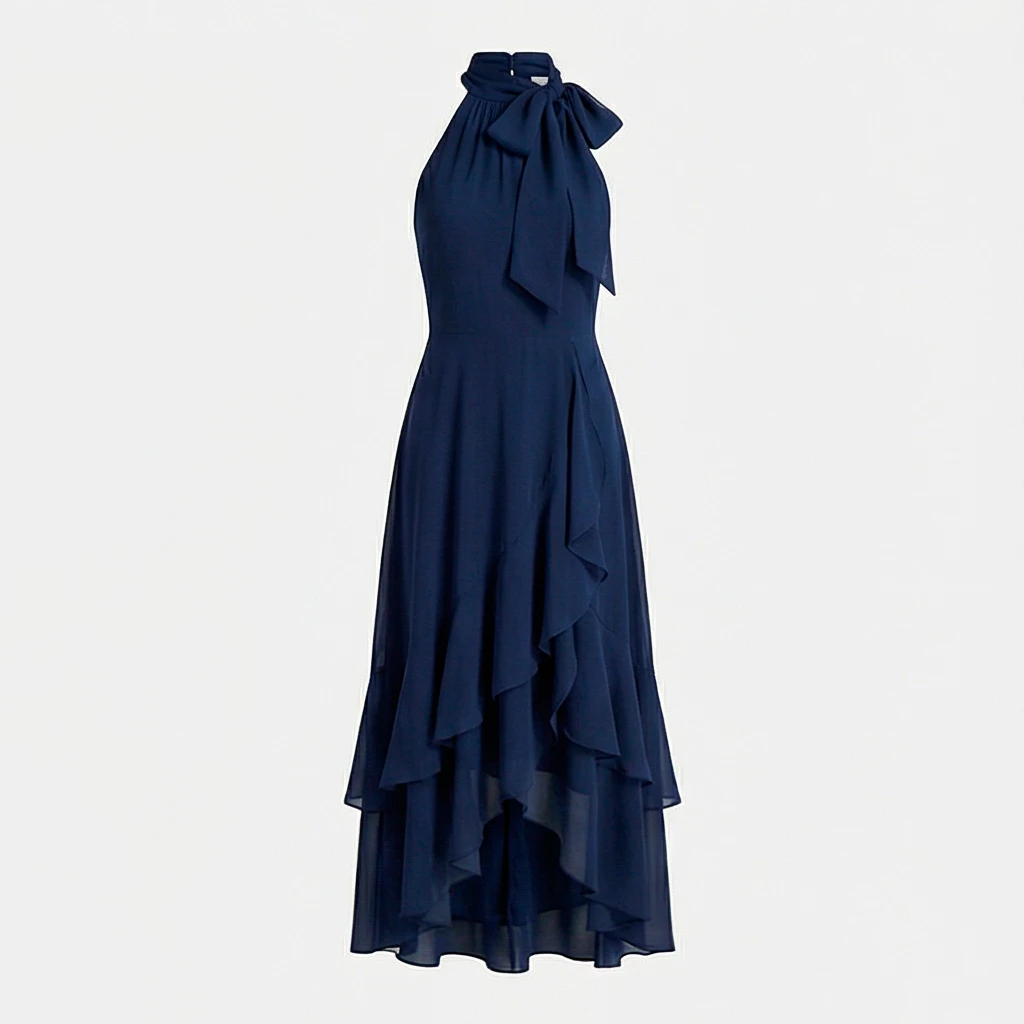 Vestido de fiesta en azul marino, con cuello halter y falda con capas que aporta profundidad y movimiento.