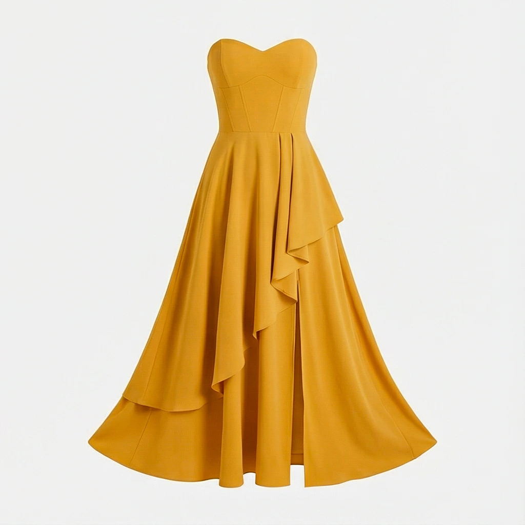 Vestido de fiesta palabra de honor en tono mostaza, con falda amplia y caída fluida de gran presencia.