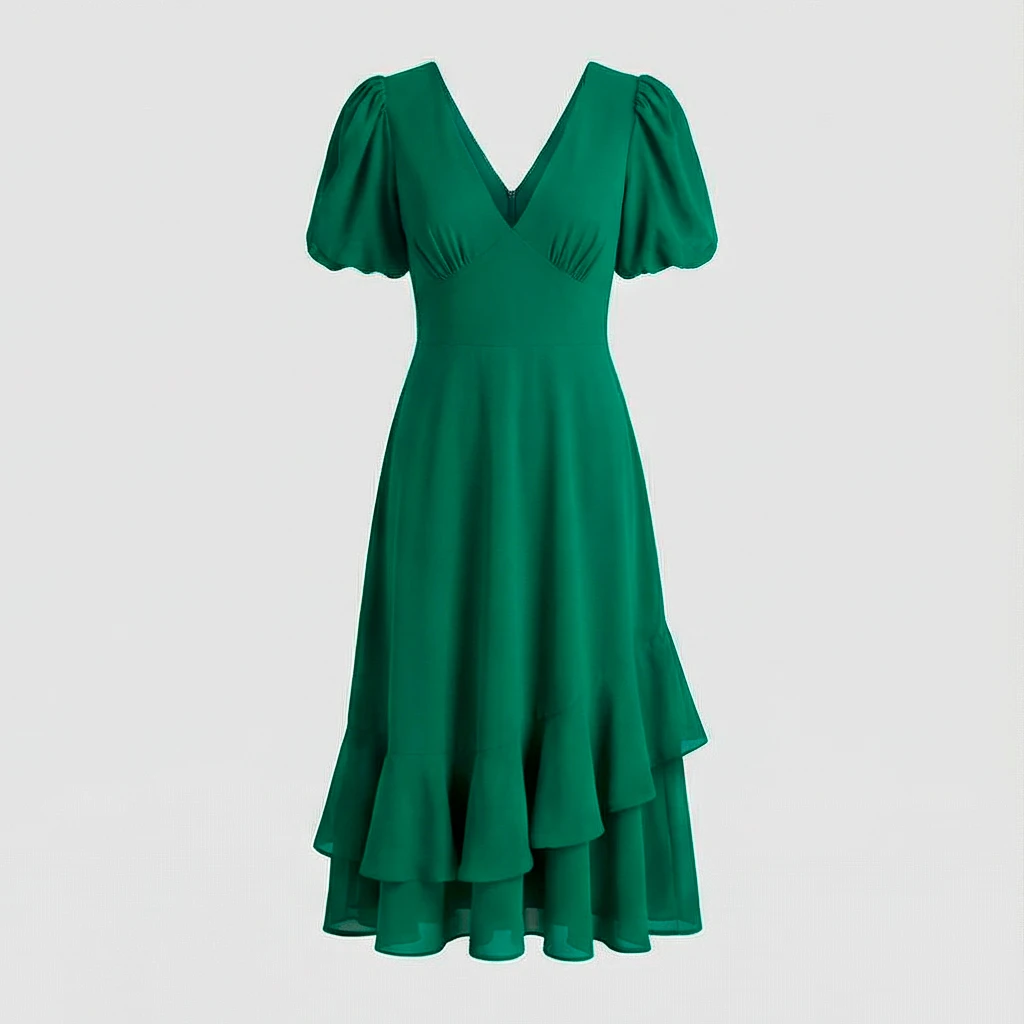 Vestido de fiesta en verde intenso, con escote en V y manga corta que realza la silueta con naturalidad.