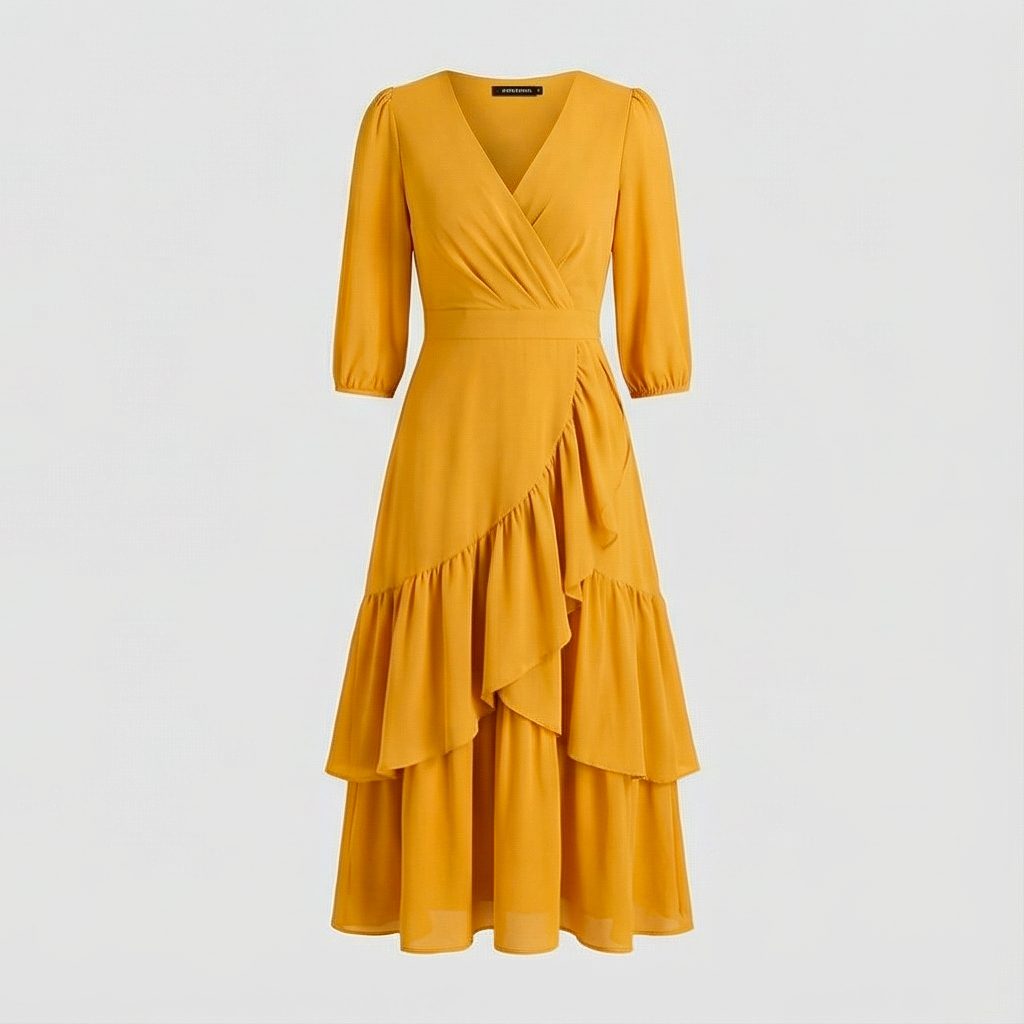 Vestido de fiesta en tono mostaza, con escote cruzado y falda escalonada que aporta dinamismo y estilo.