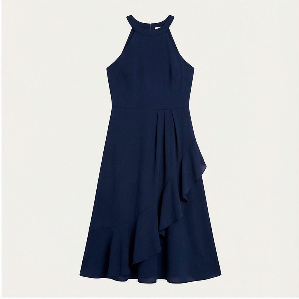 Vestido de fiesta en azul marino, con cuello alto y falda fluida que aporta una elegancia sobria y refinada.